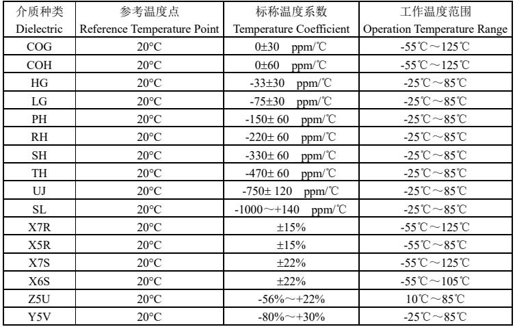 風華電容介質溫度系數對照表: