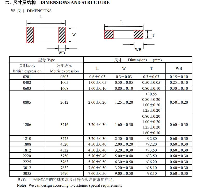 貼片電容封裝尺寸對照表選型