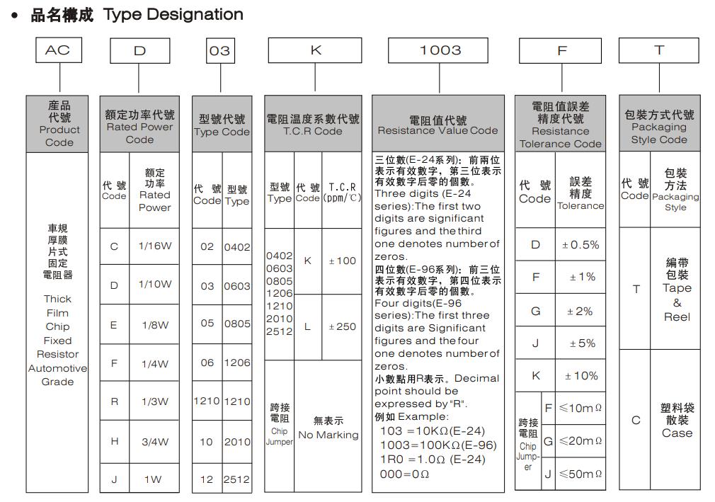 厚聲車規電阻命名規則對照表